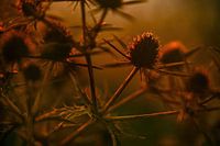 Close up van een blauwe distel, in het gouden licht van een rode zonsopkomst.