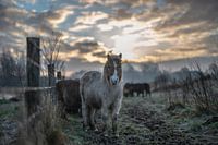 Landschap op de uiterwaarden van de Rijn in Heteren, Overbetuwe in Gelderland, met zicht op een pony onder een prachtig gekleurde wolkenlucht