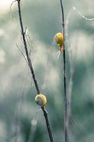 Portret van twee huisjesslakken die elk op een tak kruipen. De foto is bewerkt in zachte pasteltinten.
