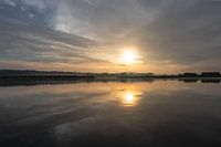 Landschap op de uiterwaarden van de Nederrijn in Heteren, op de Overbetuwe in Gelderland. Het is een prachtige zonsopkomst met lichte nevel en mooie bewolking.