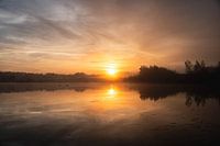 Landschap op de uiterwaarden van de Nederrijn in Heteren, op de Overbetuwe in Gelderland. Het is een prachtige zonsopkomst met lichte nevel en mooie bewolking.
