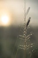 Drievoudige close up van een wildgroeiend plantje dat te vinden is in de uiterwaarden van de Nederrijn. Het plantje is bedekt met dauwdruppels en op de achtergrond zie je de opkomende zon.