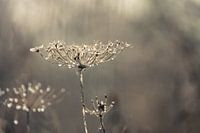 Close up van de gewone berenklauw in de dichte mist, waardoor er druppeltjes vormen aan de takken.
