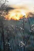Close up van late guldenroede, een wildgroeiende plant in de uiterwaarden van de Nederrijn, die tijdens de winter mooie pluisjes krijgt. De zon komt op in de achtergrond.
