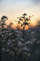 Close up van late guldenroede, een wildgroeiende plant in de uiterwaarden van de Nederrijn, die tijdens de winter mooie pluisjes krijgt. De zon komt op in de achtergrond.