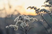 Close up van late guldenroede, een wildgroeiende plant in de uiterwaarden van de Nederrijn, die tijdens de winter mooie pluisjes krijgt. De zon komt op in de achtergrond.