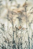 Close up van een wildgroeiende plant bij de uiterwaarden van de Nederrijn in Heteren, op de Betuwe in Gelderland. De plant is bedekt met een dun laagje rijp en de foto is bewerkt in natuurlijke aardetinten.