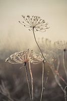 Close up van een wildgroeiende plant bij de uiterwaarden van de Nederrijn in Heteren, op de Betuwe in Gelderland. De plant is bedekt met een dun laagje rijp en de foto is bewerkt in natuurlijke aardetinten.