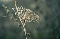 Close up van een wildgroeiende plant bij de uiterwaarden van de Nederrijn in Heteren, op de Betuwe in Gelderland. De plant is bedekt met een dun laagje rijp en de foto is bewerkt in natuurlijke aardetinten.