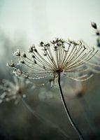 Close up van een wildgroeiende plant bij de uiterwaarden van de Nederrijn in Heteren, op de Betuwe in Gelderland. De plant is bedekt met een dun laagje rijp en de foto is bewerkt in natuurlijke aardetinten.