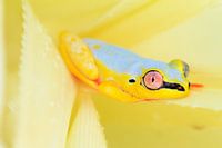 Prachtige opname van een bontgekleurde rietkikker (Heterixalus madagascariensis) in het regenwoud bij Maroantsetra op het eiland Madagaskar