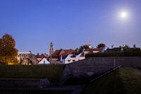 De foto is genomen in de prachtige vestingstad Heusden. Aan de horizon is de glinsterende volle maan te zien. De verschillende karakteristieke huizen en de oude kerk zijn duidelijk zichtbaar op de foto. Het prachtige nachtelijke uitzicht is scherp vastgelegd met een 400mm lens. De foto toont het rustige en prachtige stadsbeeld van Heusden. Het lijkt bijna alsof de stad in de tijd is blijven stilstaan. De kleuren zijn mooi verlicht door het maanlicht. De verlaten straat en de kerktoren versterken het mysterieuze gevoel dat de foto uitstraalt. De foto is een prachtig gedenkwaardig tafereel van Heusden.
