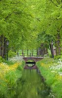 Prachtige lentetafereel uitkijkend over een slootje voor voorjaarsbloemen naar een brugje in het vestingstadje Heusden in Brabant.