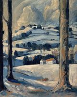 Het Heuvelland in Nederland. De Zuid Limburgse heuvels, plateau's en beekdalen creëren een lieflijk romantisch landschap. Hier en daar een vakwerkhuisje. Het middaglicht strijkt over het dikke sneeuwtapijt. De meidoornhagen tekenen strepen langs de heuvelwanden als lagen in een vers gemaakte crème-slagroomtaart.