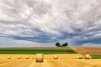 Heuvel landschap met dreigende lucht en hooibalen in de Moezel nabij Burg Eltz.