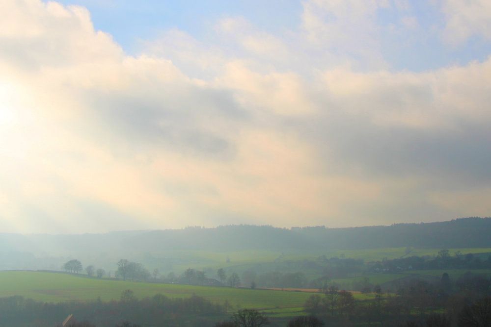 Een wandeling door het heuvelland op een druilerige dag, een korte pauze bovenop een heuvel en ineens breekt de zon door de wolken.