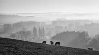 Koeien op een weide bij Gulpen tegen een mistig Heuvelland op de achtergrond.