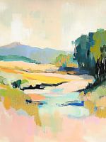 Heuvellandschap | Serenity Flowing Broadly - Dit landschapsschilderij toont een weidse, abstracte impressie van een zacht heuvellandschap, doorsneden door een rivier en omlijst door diverse geschilderde bomen en lucht, weergegeven in levendige, diverse kleurvlakken.