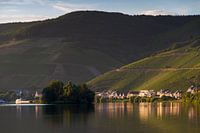 Prachtige opname van het dorpje Zell (an der Mosel) aan rivier de Moezel in Duitsland tijdens een zomermiddag met reflectie en heuvels op de achtergrond