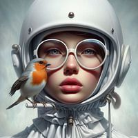 Rijdend op je brommertje, met je vogeltje bij je, in dit surrealistische beeld is het mogelijk. Wat een heerlijk beeld van een jonge vrouw met een helm op en een vogeltje dat met haar mee gaat.