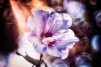 De blauwe hibiscusbloem staat recht in de oranjekleurige stralen van de zon. Het gebruik van een oude lens op een moderne camera zorgt ervoor dat deze zonnestralen zo intens te zien zijn.
