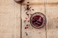 Shot van boven van hibiscuswater met gedroogde hibiscusbloemen erlangs. Op een houten ondergrond. Het hibiscuswater zit in grote tumbler glazen.