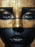Een intrigerend schilderij toont een vrouwengezicht dat deels verdwijnt in goud en zwart effecten. De verf vloeit als een masker over haar serene gelaat, wat een gevoel van mysterie en kracht oproept. Het contrast tussen het glanzende goud en diep zwart versterkt de dramatische, bijna droomachtige uitstraling.