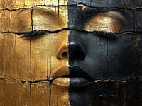Een intrigerend schilderij toont een vrouwengezicht dat deels verdwijnt in goud en zwart effecten. De verf vloeit over haar serene gelaat, wat een gevoel van mysterie en kracht oproept. Het contrast tussen het glanzende goud en diep zwart versterkt de dramatische, bijna droomachtige uitstraling.
