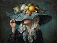 Hidden Blue Hat - Een vrouw verscholen achter een gigantische, blauwgroene hoed die meer lijkt op een stille kamerplant of een feestelijke schaal vol fruit dan op een gewoon hoofddeksel. Op dit schilderij is het eerste wat je raakt de hoed zelf: breed, zacht geplooid, met een stof die lijkt te glanzen en te kreuken tegelijk. Bovenop die hoed een kleine explosie van citrus en bloemen — twee ronde sinaasappels of mandarijnen, een gele citroen, en rozen en pioenrozen die half open bloeien. Het contrast tussen het koele blauw van de hoed en het warme geel en oranje van het fruit maakt dat de hoed zichzelf presenteert als het hoofdthema: een hoed schilderij dat tegelijk stilleven en portret is. Deze combinatie — hoed met fruit — geeft het werk een speelse twist: het is een vrouw schilderij maar dan met een stillevens-injectie.