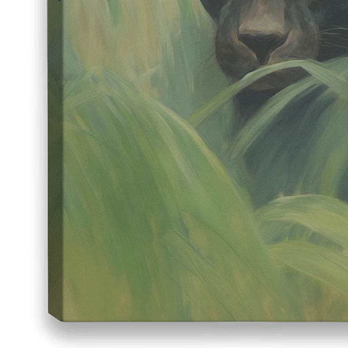 Een kleurrijk digitaal schilderij van een jaguar omringt door palmbladeren. Het werk geeft een dromerige en klassieke uitstraling aan uw interieur!