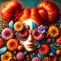 Portret van een meisje, jonge vrouw, met rood haar en een bril, die bedolven lijkt te zijn onder de kleurrijke bloemen. de bloemen in paars, geel, rood, roze, blauw zijn helemaal om haar heen tot zelf achter haar bril, het meisje (de vrouw) lijkt zich achter deze prachtige bloemen te verstoppen. een surrealistisch portret, maar door de hoeveelheid kleuren heeft het ook iets vrolijks, maar een vreemd gezicht blijft het.