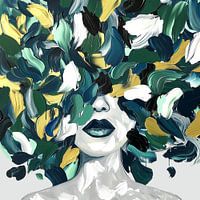 Vrouwengezicht gedeeltelijk verborgen achter een weelderige explosie van bladvormige penseelstreken in een dynamisch palet van groen, blauw, zwart en goud. De vrouw draagt een serene uitdrukking en haar gesloten ogen suggereren een staat van vrede of introspectie. De bladeren lijken bijna als een natuurlijke kroon of aura rond haar…