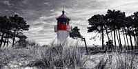 De zuidelijke toren op Hiddensee, een baken in het zuiden van het eiland in de Oostzee bij het duin aan het strand. Panorama formaat en gedeeltelijk gekleurd.