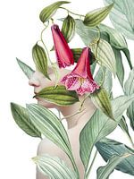 Surrealistisch maar ook romantisch portret van een vrouw, half verscholen achter bladeren en tropische bloemen.