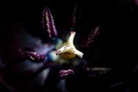 De zonbeschenen witte kleur van de stamper tussen de meeldraden van een verder dieppaarse tulp, alsof die de insecten roept van "hiero! Hier moet je zijn!' . Ik weet niet precies welke soort deze tulp is, misschien is het wel de Queen of Night.