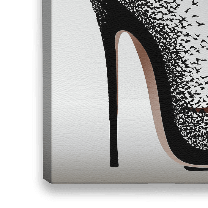Maak van je muren een statement van elegantie en verbeelding met deze surrealistische High Heel Birds Wall Art. Dit adembenemende ontwerp transformeert een slanke zwarte naaldhak in een zwerm vliegende vogels, symbool voor vrijheid, transformatie en gedurfde vrouwelijkheid.