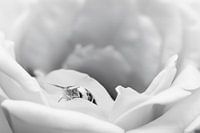 Ontdek de delicate schoonheid en serene harmonie van deze high key compositie, waarin een elegante witte roos centraal staat op een achtergrond van zuiver wit. De fluweelzachte bloemblaadjes vormen een perfecte setting voor een klein wonder van de natuur: een traag voortbewegende slak die als een schildknaap zijn rozenkasteel beklimt. Deze afbeelding is ideaal voor liefhebbers van subtiele, zwart-witte kunstwerken die een rustgevende sfeer in hun interieur willen creëren.
