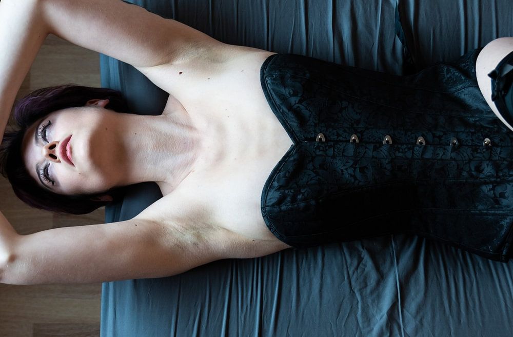 High angle view of a 23 year old woman lying on a blue bed, Brussels, Belgium