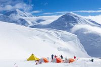 Twee bergbeklimmers geven elkaar een high five in een kampement op de Kahiltna gletsjer op Denali in Alaska. Op de achtergrond Mount Foraker.