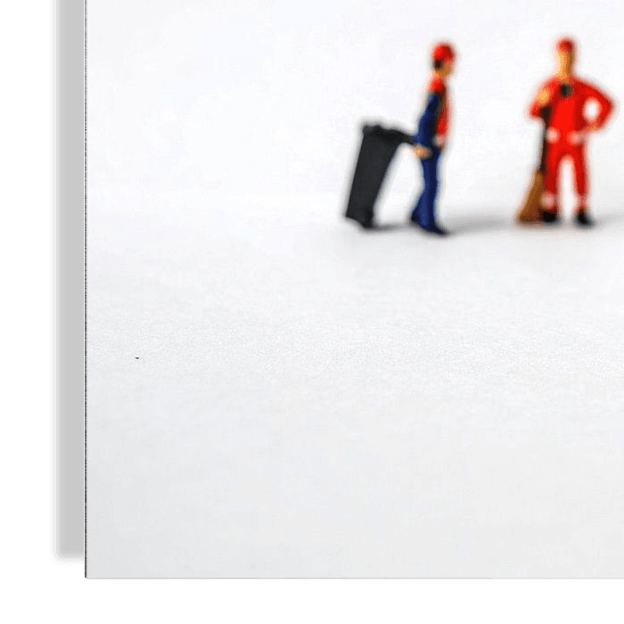 Kleine miniatuur figuurtjes voeren onderhoud uit aan een gipsen model van een gebit. Met een hamer, drilboor en ander gereedschap lijken zij aan het werk te zijn. In de verte wachten er twee met een kliko om de rommel op te komen ruimen.