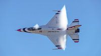 Thunderbird #5 vliegt bijna Mach 1. Door die hoge snelheid en het vocht in de lucht condenseert die lucht rond het toestel en is het wolkje boven de cockpit en de grotere wolk bij de vleugels goed zichtbaar.