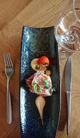 High wine, food, hapje. Het eten was mooi opgemaakt op dit smalle bord. Overheerlijke ham, tomaat en gegratineerd met slablaadjes. Bij deze gang dronken we een lichte rose in een mooi glas.