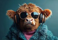 Hooglandse koe met zonnebril en koptelefoon, gekleed in gezellige winterkleren. Schattig dierlijk karakter portretconcept voor een muziek album cover of grafisch ontwerp achtergrond. Fotorealistische illustratie van een grappige Schotse Highlands babystier met stijlvolle accessoires. 8K, hyperrealistische stijl, zeer gedetailleerd.