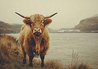Een foto van een oude hooglandkoe in de stijl van Arandy, Schotland, met daarachter de stad Inveraray. De foto is van een afstand genomen en heeft een vintage uitstraling. Het is een zonnige dag met zacht licht en er hangt een mistige sfeer over het water. Het dier ziet er majestueus en krachtig uit met zijn lange horens en dikke,…
