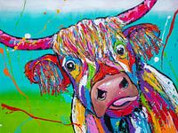 Kleurrijke koe op een groen-blauwe achtergrond van de kunstenaar Renate Rolefes.