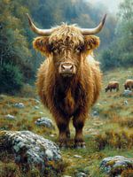 Een majestueuze Highland koe, belichaming van kracht en rust terwijl het stoïcijns waakt over het mistige land, een symbool van standvastigheid in een steeds veranderende wereld. Op de achtergrond is een schilderachtig landschap met een verscheidenheid aan groene tinten en een mistige sfeer die het hoofdmotief benadrukt. In de diffuse…
