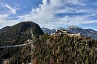 De voetgangershangbrug Highline179 in Reutte, Tirol, Oostenrijk verbindt de burchtruïne Ehrenberg en Fort Claudia en ligt in de Lechtaler Alpen.