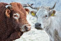 Een stier en een koe van het ras Blonde D'Aquitaine op een weiland op het eiland Sardinië in de Middellandse Zee.