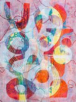 Deze monotype of monoprint is gemaakt met een gelliplate en acrylverf. Een uniek handgemaakt en eenmalig werk, er kan maar 1 afdruk worden gemaakt van je ontwerp. Door de grafische druktechniek en het gebruikte papier ontstaan er allerlei structuren en effecten. Dat maakt het interessant om naar te kijken. Hier zijn vele lagen over elkaar geprint, met zelfgemaakte sjablonen ertussen. Dit heeft als gevolg dat er een bepaalde diepte in het werk lijkt te zitten. Het is een abstract werk, maar toch zie ik hier een man en een vrouw in, staand naast elkaar, omringd door jonge kinderen. Maar dat is mijn verbeelding. De kleuren zijn blauw, oranje en geel met wat wit voor de frisheid. Een modern schilderij in je interieur.