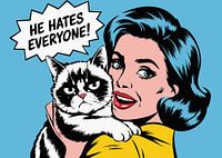 Een retro poster in stripstijl van een vrolijke vrouw die een chagrijnige kat vasthoudt en zegt "Hij haat iedereen!". De overheersende kleur in het werk is blauw.